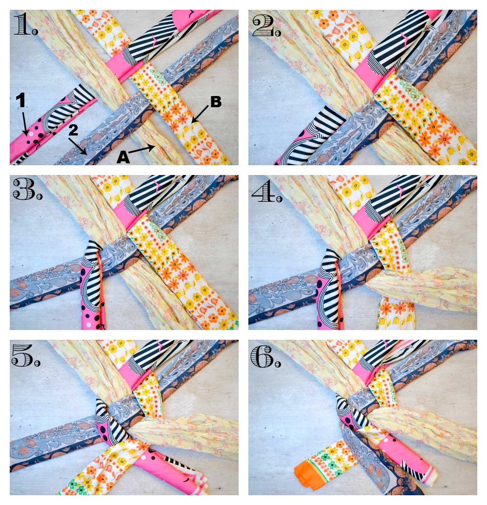 Na dolní patro je nejlepší nastudovat cop ze 4 pramenů. Je pevnější a širší než ten ze tří, takže bude stabilnější i během pečení a vánočka neztratí kýžený tvar. Není to žádná věda. Nejdřív to natrénujte s něčím jiným než s těstem, třeba provázky. Začínáme plést od prostředka vánočky směrem ke koncům a postupujeme během toho vždy od středu ke kraji a pak zkřížíme dva střední prameny. Důležitá je základní počáteční pozice, pak je to lehčí než se zdá a než se to popisuje. Nachystala jsem vám fotopostup se šátky, který se pořád dokola opakuje. Pokud byste se na to stejně necítili, udělejte cop jen ze 3, takže na začátku rozdělte těsto jen na 8 dílů.