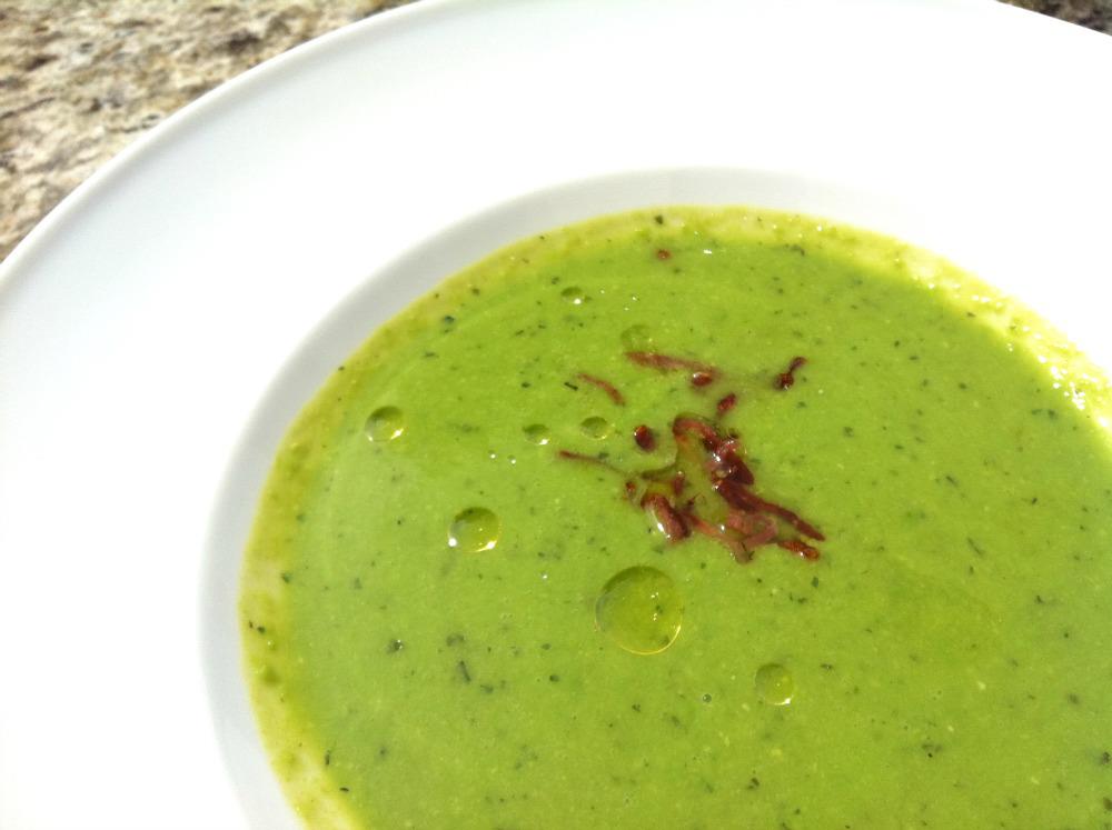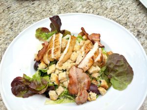 Konkrétně k pokrmům – v Caesarovi jsem se už trochu vyjádřila. Našla jsem tu obří lupena dubáčku, která do tohohle salátu samozřejmě nepatří, což o to, ale ta lupena sem byla dána asi jen na ozdobu, takže dresink neviděla ani z jedoucího vlaku. Přehršle krutónů a drobečků kolem, pod kterými možná najdete i římský salát se správnou zálivkou. Jen možná. V lístku mají psaný salát ledový. O kusu anglické lisované slaniny není třeba asi nic říkat. Takže tohle je slabší. Hráškový krém měl skvělou barvu, dost hustou konzistenci, ale hlavně poměrně hrubou strukturu, nebyl vyšlehaný,