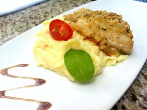 Moje mamka miluje lososa a miluje ho hodně opečeného, takže byla z tohohle chodu nadšená. Na mě by byla ryba díky tomu žáru příliš suchá. Zřejmě ho tu podrobují stejnému postupu, jako bifteky. Ale nemít k tomu ten špenát se smetanou, asi by člověk musel každé sousto zapíjet. Vedle je okouník mořský v citronové krustě. Ten byl zpracován šetrněji. Bramborová kaše jako domácí. Bohužel ten lupínek a půlka rajčátka je co do foodstylingu poněkud přežitek a nepříjemně zbývající prostor na předlouhém talíři vždycky vyplnit