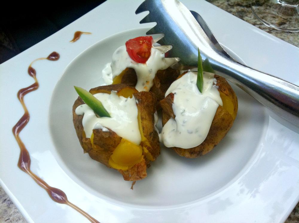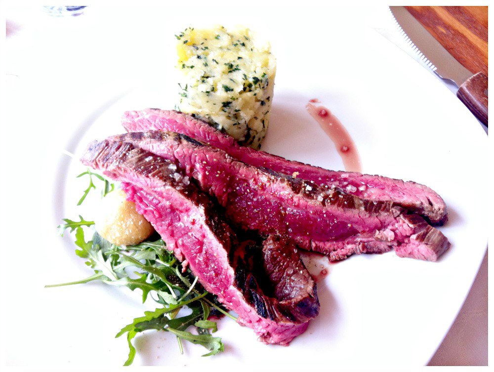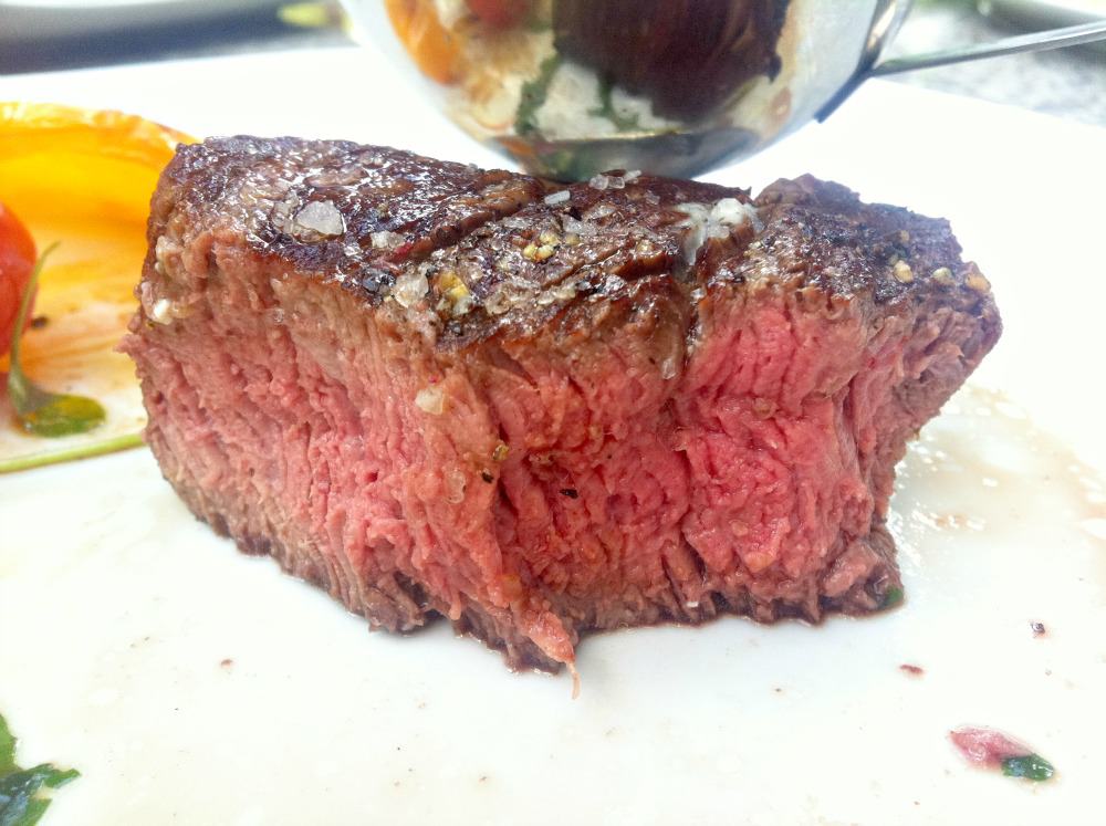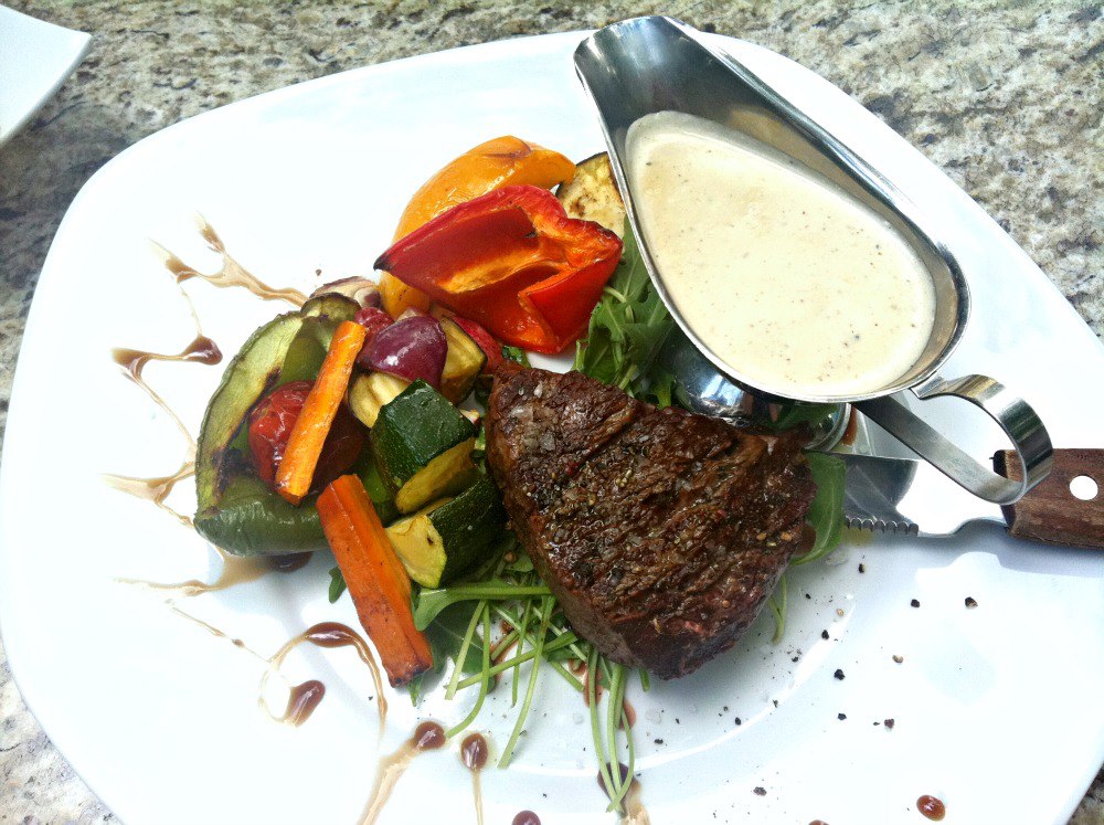 Já sem tedy chodím na hovězí. Nalevo máme pupek se šťouchaným bramborem. Rukola pod ním měla být ochucená. nevadilo by ani pár kapek nějaké silné omáčky opět na dolazení a pozvednutí pokrmu. Pak tu máme 200g argentincké svíčkové medium rare. K tomu koňakovo-pepřovou omáčku, grilovanou zeleninu a navíc vedle ještě brambory pečené v peci s jogurtovým dresingem. Bez omáčky by bylo smutno,