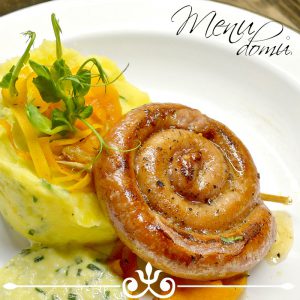 Vinná klobása k Vánocům prostě patří. Někteří ji obalují v mouce, jiní v trojobalu. Já zvolila přírodnější cestu. Trojobal totiž schovávám na kapra na Štědrý den večer, chci se prostě těšit. A do té doby jíst chutná, ale nijak zvlášť hutná jídla. Proto volba padla na vinnou klobásku s pyré z brambor a červené čočky a k tomu mrkvové tagliatelle a rakouská pažitková omáčka. Můj spolehlivý zdroj na perfektní a neošizenou klobásu je u Sváčka na Arbesáku v Praze.