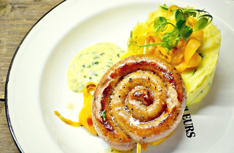 Z klobásy stočte 4 pevné šneky a propíchněte špejlí. Na troše másla na střední plamen po obou stranách nechte na pánvi zezlátnout, tzn. tak 3 minuty po každé straně max. Teplotu hlídejte, ať klobáska moc neprská nebo nezačne praskat střívko, kdyžtak ztlumte. Pak přemístěte na pečící papír na pekáčku, opepřete a dejte do trouby na 170°C na asi 20 minut dotáhnout. Vypečenou šťávou pak klobásky na talíři polijte.