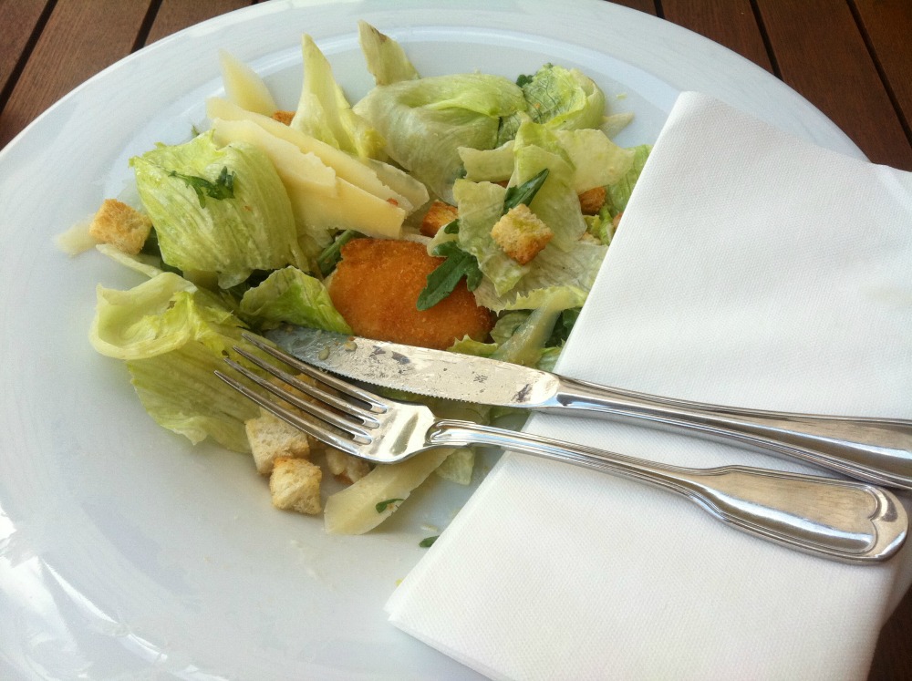 Pak jsem si ale (pro některé možná trapácky) dala salát Caesar 195,- Kč. Já na něm totiž krásně otestuju restauraci, protože jsem ho měla už tolikrát a na tolika místech (a v tolika verzích), že se z toho dá ledacos odvodit. Tady byl dokonce v nabídce s možností přidání nejen kuřete a marinovaného lososa, ale se sýrovou smaženkou, takže to jsem si vážně nemohla nechat ujít – další rozšíření caesarovských obzorů. Místo toho jsem si ale připomněla, jak moc se na tak jednoduchém salátu dá pokazit. V jedné věci je to teda i moje chyba – v návalu vzrušení nad inovující sýrovou smaženkou jsem si nepřečetla popisek k salátu. I když kdo by si ho četl, ten salát přece všichni znají a ví, co do něho patří. Tady ale byl ledový místo římského salátu přiznaný už v menu. Navrch jsem tam dostala ještě rukolu. Ale proč proboha dávat ledový salát a rukolu do Caesara? Jenže to nejhorší byl dresing. Nevýrazný, necaesarovský, spíš chutnal jen jako zředěná majonéza. Žádné stopy po chuti ančoviček, dijonu, nebo alespoň citronu. Prostě zapomenutelná verze slavného salátu, nehledě na přemládlý parmazán, jehož hobliny byly tak pružné jako byste si štrejchli trochu mladé goudy. Úvahy o tom, zda to pořádný parmazán byl, nechávám stranou. A že sýrová smaženka nechutnala líp než smažák ve čtyřce kdekoli, taky. Zapomněla jsem salát vyfotit na začátku, natočený na videu ho pak mám… nicméně jsem si alespoň vyfotila, jak to vypadalo, když jsem (rychle) dojedla.