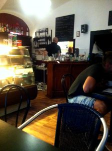 Dostala jsem ale ještě jeden tip na krátkou zajížďku, do Bistrot de Papa v Počátcích. Nedělní otevíračka do 16:00. Spěchali jsme na třetí odpolední, abych stíhala alespoň polévku nebo zákusek a kávu. Když jsem vešla do dveří, chvilku jsem nemohla věřit vlastním očím, jak se špinavé nádobí válelo nejen všude na baru, ale dokonce viditelně i na zemi za ním (jen si ten obrázek zvětšete a hledejte – najdete). Všechno naházené v jednom chumlu. V minikuchyňce se tísnily asi čtyři obsluhující číšnice, které dávaly něco z plastových krabiček do talíře a do mikrovlnky a při tom si neustále olizovaly prsty od toho, jak servírovaly někomu zákusky na dezertní talířky a všemu se hihňaly. Už v tuhle chvíli jsem na to neměla nervy, ale vyčkala jsem na obsluhu. Trvalo to 10 minut u stolu plného špinavého inventáře po minulých hostech. Dvě třetiny zákusků už byly vyprodané. Teplá i studená jídla z denní nabídky také. S větou:“Jestli se chcete najíst, klidně jděte jinam, my toho máme už dneska moc“ jsem se sebrala a odešla. Korbáčik byl nakonec velmi dobrou volbou. Pardon, ale tady už mě neuvidí. Obsluha absolutně nezvládá plné bistro a nějaký ten pátek už tam asi také pracují, aby nemuseli být situací překvapeni.