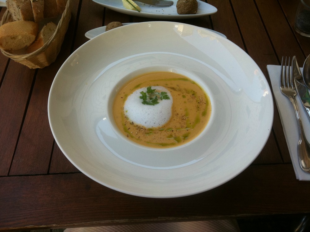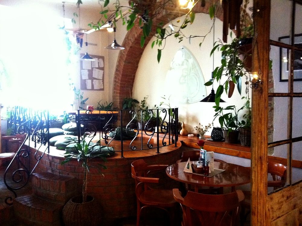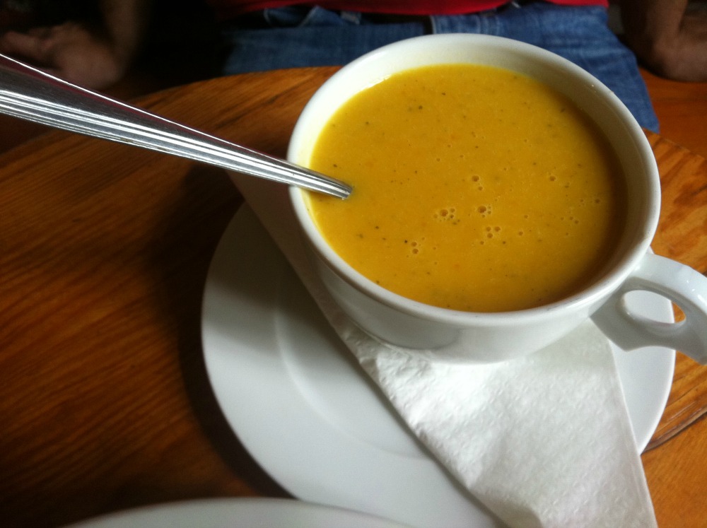 A jedeme do Znojma. Překvapivě pěkná vyhlídka od kostela Sv. Mikuláše (ten domeček s tou zahrádkou ve středu fotky chci, nevíte, kdo tam bydlí? :-D). Nakládačky se na trhu už prodávaly, samozřejmě. A kousek od kostela restaurace Na věčnosti. Můj přítel to komentoval slovy „závan dredů nemytých“ (obrazně řečeno kvůli skladbě menu a tudíž tipované cílové skupiny, ne že by to tu smrdělo), já zavzpomínala na svá mladá léta (a nemyté dredy) a odebrala se Na věčnost za zdravou a vesměs hlavně vegetariánskou stravou. Batátový krém se zázvorem a chilli. Ten si dal on, nic jiného by z lístku asi nejedl, nicméně ho dal v hrníčku až do dna, a že to byl čvochtan.