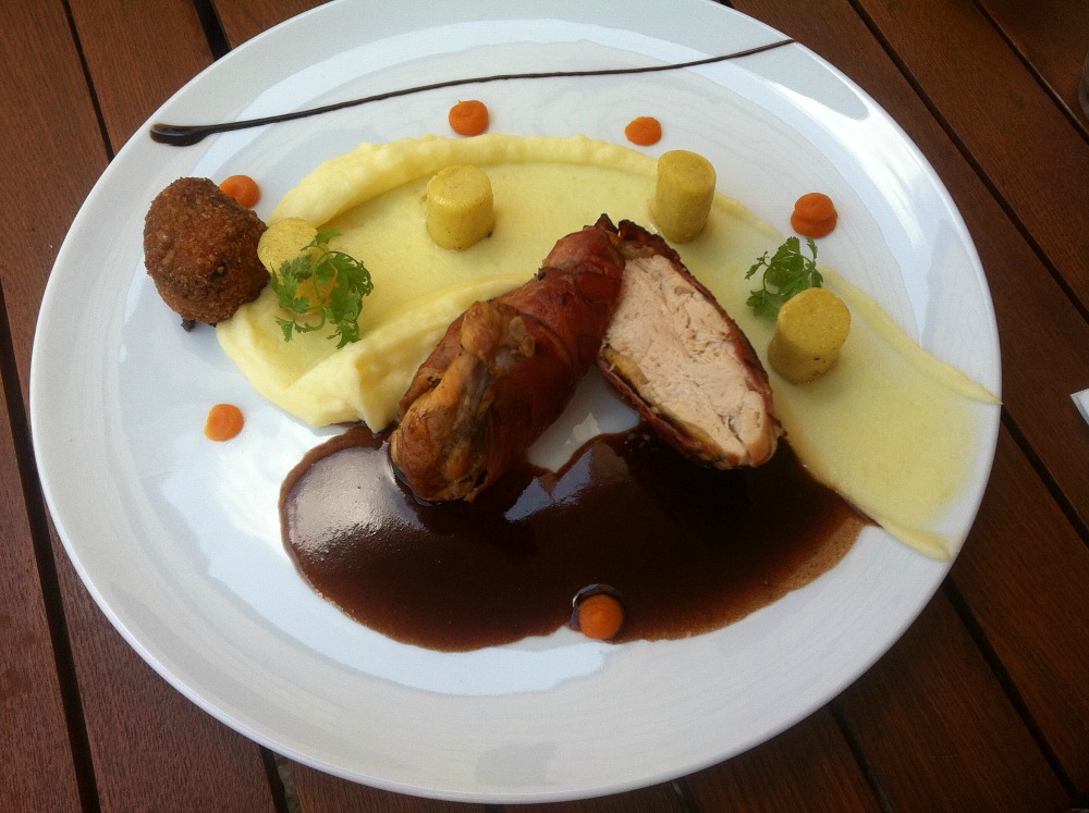 Coby posibilní kousek k natáčení nějakého svátečního MENU domů jsem si vysnila až to následující – Prsíčko z perličky pečené v sušené šunce s omáčkou Bokovka 2009, krvavým jelitem, bramborovou kaší a konfitem z čekanky za 365,-. Taková sláva jako hovězí krk minulý rok to taky zdaleka nebyla. Masa a přílohy se tu dávalo vždycky spíše neúměrně v neprospěch přílohy, ale tenhle máz kaše, od které jste si museli odečíst prakticky nepoživatelné a neužvýkatelné bramborové šištičky, byl ku masu opravdu značně nedostačující. Je sice pěkné, že z perličky nebylo jen obyčejné prso, ale supréme s křídlovou kostičkou, ale k čemu mi to je, když se kvůli tomu musí maso zbytečně sušit, aby u kosti bylo vše propečené. O šunce z vrchu a sušení to platí v tu chvíli dvojnásob. Smažené jelítko celkem zajímavé… ale pokrm postrádal ten švih a šmrnc minulého roku.