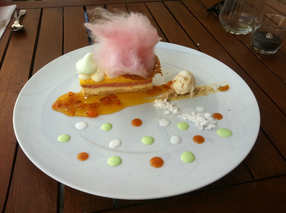 Dezert vypadal zato velmi poutavě. Tvarohový dortík plný citrusových chutí s cukrovou vatou, rakytníkem od pana Cvrčka, mandlovou drobenkou a zmrzlinou z ricotty a pražených fíků za 125,-. Fakt skvělá práce, co do vzhledu, naservírovala to asi Alenka právě se vracející z říše divů na dojezdu. Ale zůstala bych jen u koukání. Ne, dala bych si i tu cukrovou vatu. A pusinek nahoře. A rakytníku. A zmrzliny. Vlastně by všechno šlo, až na to hlavní. Když se řekne tvarohový dortík, představíte si něco přírodního, lehkého. Citrusové chutě byly poněkud chemické, pardon, prostě to celé chutnalo jak z laborky. I konzistence podivná. Ne dost lehký, aby byl našlehaný. Ale ne dost těžký, aby to byla hutná bomba třeba jako cheesecake.