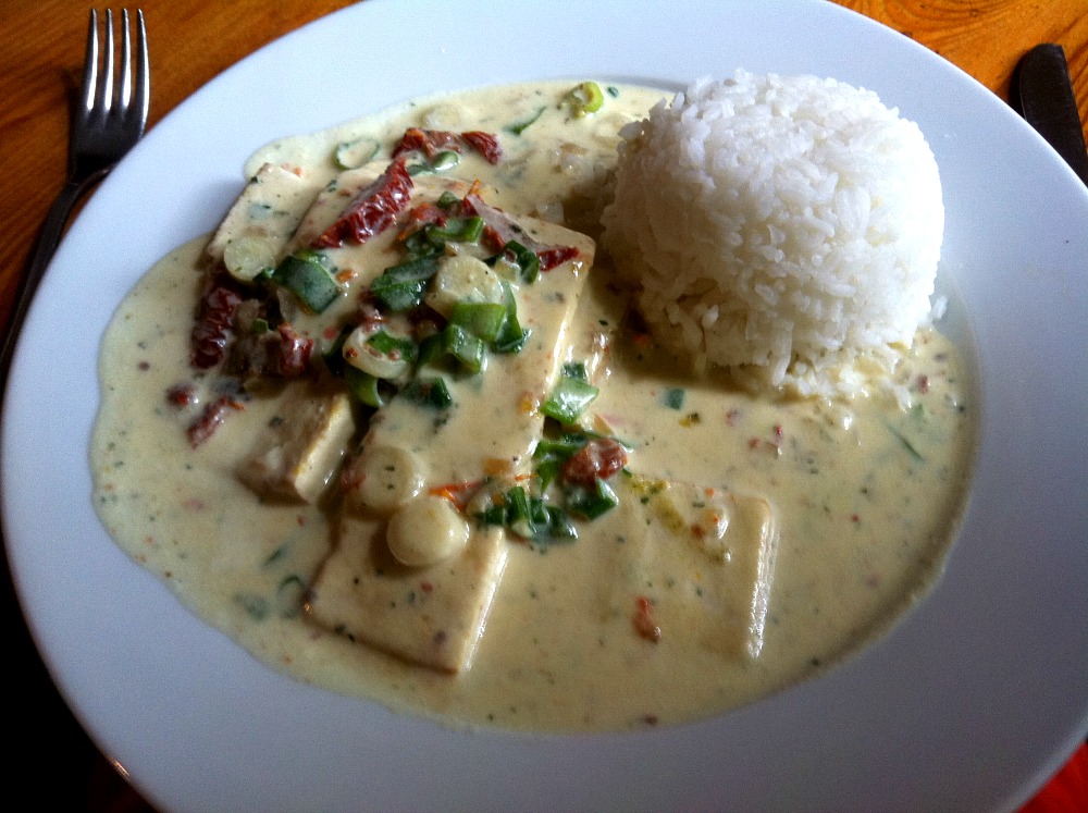 Za mně zas grilované tofu s omáčkou ze sušených rajčat a jasmínovou rýží. Porce jak blázen a navíc mi to chutnalo, bifťáky já ráda, ale klidně někdy ocením i dobře udělané tofu. Ale je fakt, že vegoušům zas rychle vytráví. Spolu s okurkovou vodou a bezinkovou limčou nás nezdrtil účet za 294 Kč a jeli jsme spokojeně na Mikulov.