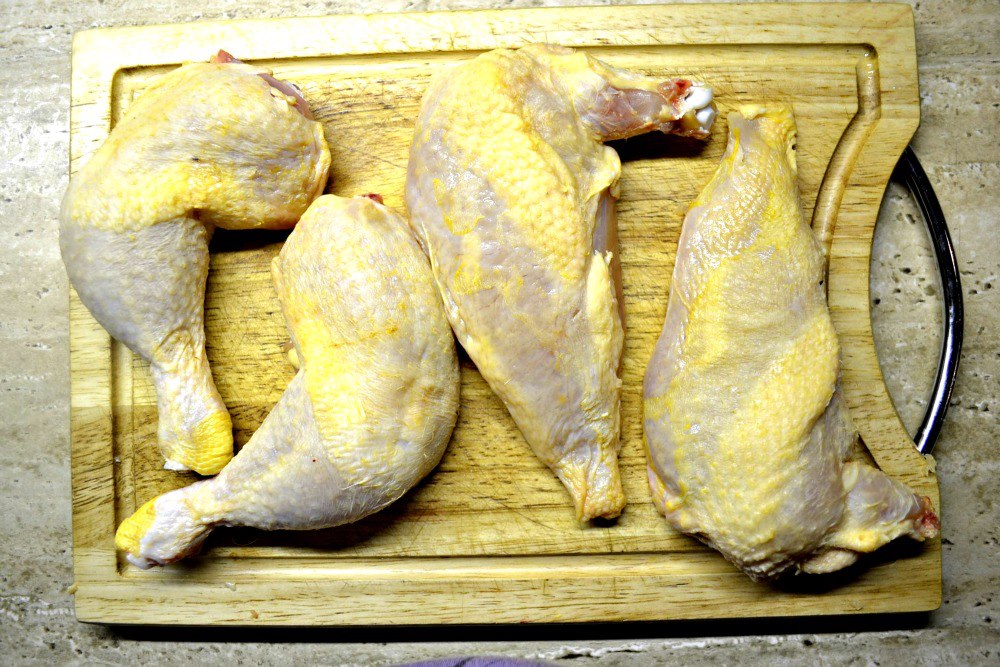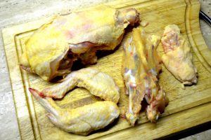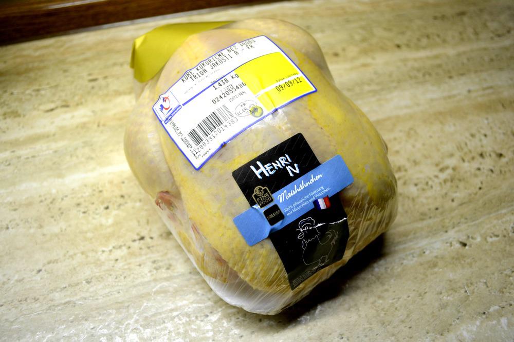 Ale teď to hlavní – co je řešením? Makrokartička… Stačí, aby někdo v dostupných rodinných větví měl IČ a vyplnil na www.makro.cz formulář, zabere to asi 3 minuty… a za 3 dny si na určené prodejně může vyzvednout vstupenku do lepšího světa. Samozřejmě, pokud máte některou z prodejen v rozumné vzdálenosti. Tam totiž dováží drůbež z Francie za velmi rozumnou cenu a Henri kukuřičné kuře (obvykle za 108 Kč/kg, v akci i kolem 90 Kč/kg) a to je to, co hledáte! Tradiční kousek má kolem kila a půl. Lze ho koupit jen vcelku bez drobů. Skvělé je, že na tomhle masu není znát mražení, takže stačí přinést domů, rozporcovat a nechat zamrazit.