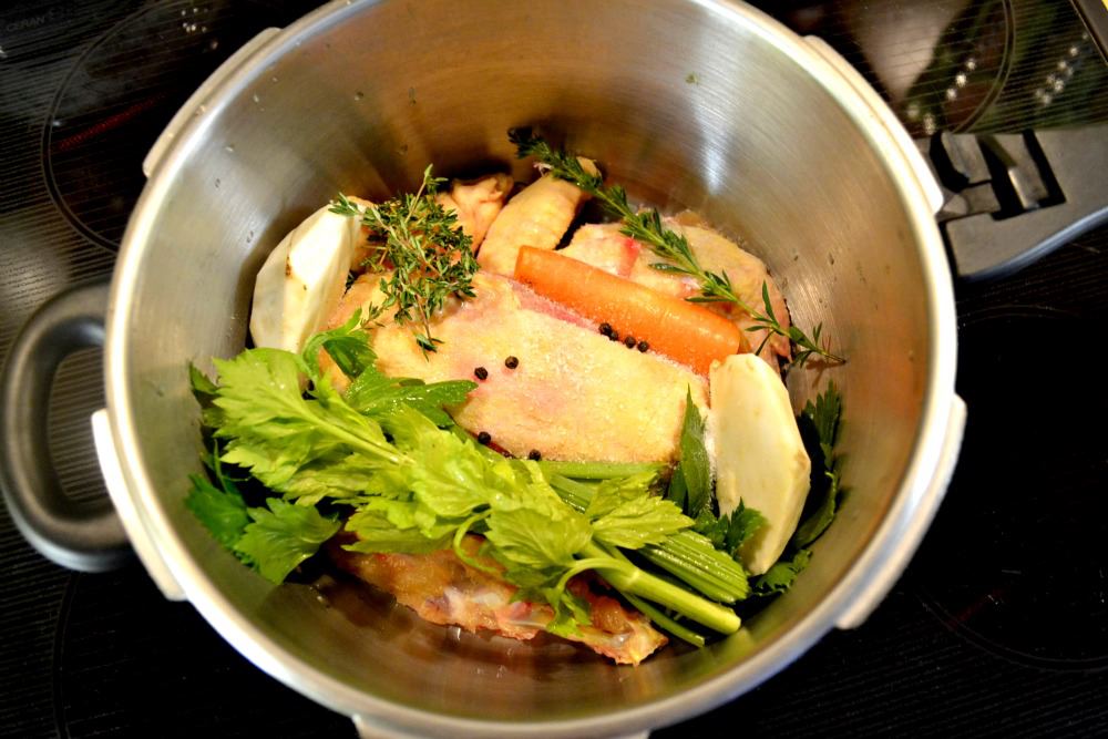 Pro tmavší kuřecí vývar všechnu zeleninu nejdřív orestujte. Jinak vložte všechny ingredience na vývar do papiňáku, uzavřete a vařte 30 minut (to je opravdu doba varu… prvních deset minut ohřívání uvnitř nepočítám). Pokud tlakový hrnec nemáte, v tom případě to chce velký hrnec s dobře těsnící pokličkou a vařit tak 75-90 minut. Sketet před tím umyjte, mrkev, celer, řapík i cibuli oloupejte, pokrájejte vždy na 2-3 kusy. Soli dejte 2 čajové lžičky, kdyžtak dochutíte pak. Po uvaření oberte maso (mělo by odpadat od kostí, pokud ne, vařte déle). Přeceďte a zeleninu vyhoďte. Ta už posloužila. Do samotné polévky to chce dát čertvou mrkev, na drobnější kousky, ale i tak se ve vývaru bude 10-15 minut vařit. Pokud nechcete, aby těstoviny vývar lehce zakalily, uvařte je v jiném hrnci normálně ve vodě ke konci varu vývaru, přeceďte a až uvařené je do něho přidejte. No a pak to chce jendochutit solí a pepřem a na poslední chvíli přidat na prohřátí zmražený hrášek a nasekanou petrželku. :)